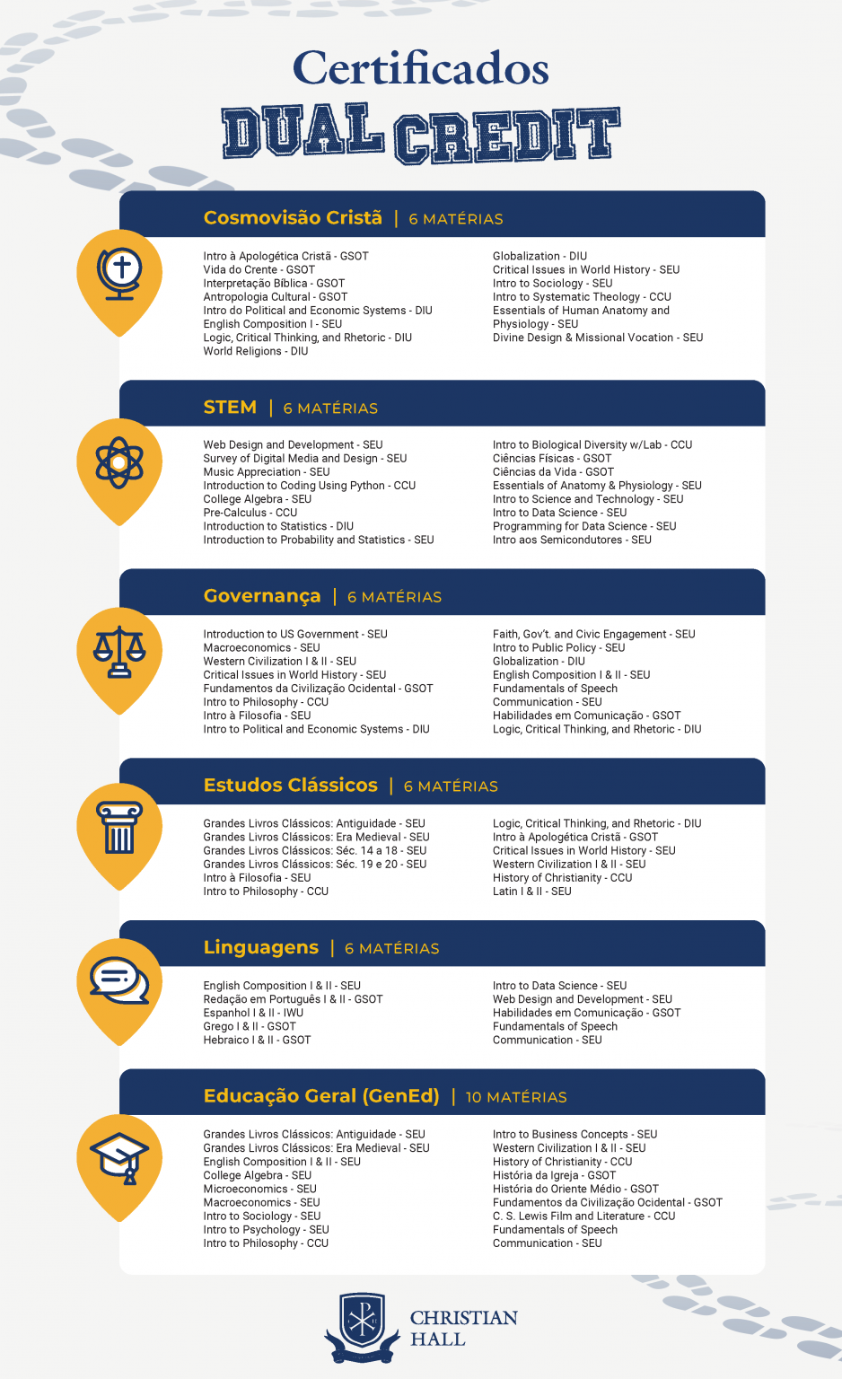 Nossos certificados proporcionam uma oportunidade de concentrar seus estudos no Programa Dual Credit em áreas de formação relacionadas a seu curso de graduação e/ou sua eventual profissão. Destaque-se e prepare sua mente ganhando um Certificado Dual Credit eliminando matérias da sua graduação ao mesmo tempo!